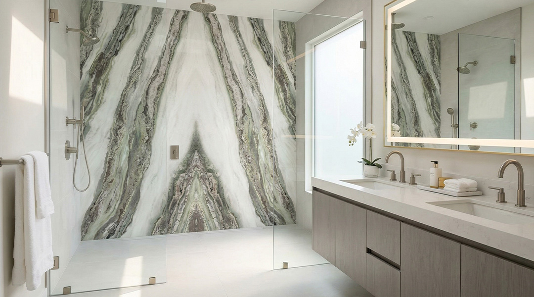 Bookmatching is more than a layout technique, it is an architectural statement. When executed with premium materials and expert craftsmanship, bookmatched stone and porcelain surfaces become the defining feature of a space.